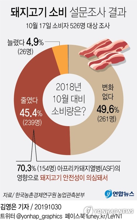 (세종=연합뉴스) 이태수 기자 = 국내에서 한 달 넘게 이어진 아프리카돼지열병(ASF)의 영향으로 돼지고기 가격이 급락하고 있는 가운데, 소비자들이 실제로 돼지고기 구매를 꺼린다는 조사 결과가 나왔다.