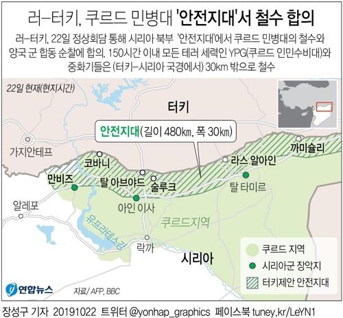 터키와 러시아 정상은 지난 22일 터키가 시리아 북부에 대한 공격을 멈추는 대가로 이곳에 안전지대를 정해 이곳에서 쿠르드족 민병대가 29일 오후까지 모두 철수하고 양국 군대가 함께 순찰해 치안을 유지하기로 합의했다.