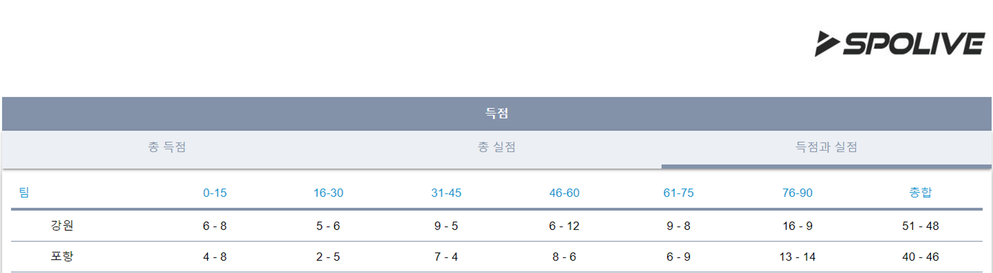 포항의 승리와 양 팀 통틀어 3골 이상의 경기 결과를 예측한다. '스포라이브(SPOLIVE)' 데이터에 따르면, 75분을 기점으로 양 팀의 득점과 실점 양상이 맞물려 있음을 확인할 수 있다. ACL 진출권 가능성을 놓고 치열하게 맞붙을 것이라는 점과 강원이 6경기 연속 실점을 허용하고 있다는 점에서 끝날 때까지 긴장을 놓을 수 없는 다득점 경기가 예상된다. 또한 포항이 최근 홈경기에서 자신감을 드러낼 정도로 홈 성적이 좋은 반면, 강원은 원정 4연패로 부진하고 있다는 점을 고려해보았을 때 이 경기 포항의 승리를 예상한다.