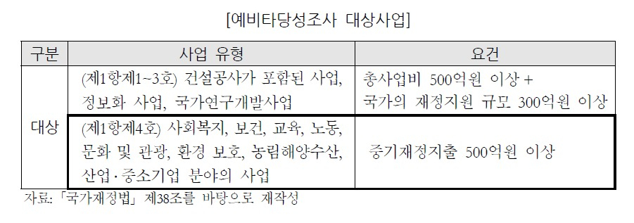 현행 국가재정법은 사회간접자본(SOC) 사업뿐 아니라 복지·소득이전 사업도 중기지출 규모가 500억원 이상이면 예타 조사 실시를 의무화하고 있다.