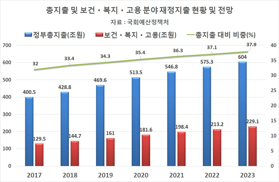 실제로 내년도 보건·복지·고용 분야 예산은 총 181조6000억원으로 총 지출 대비 비중이 35.4%에 달한다. 2015년 30.8%에서 빠른 속도로 증가 중이다. 2023년에는 37.9%까지 치솟을 전망이다. 이에 따라 보건·복지·고용 예산은 2015년 115조7000억원에서 8년 만에 229조1000억원으로 100억원 이상 증가할 것으로 예상된다.