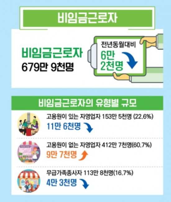 5일 통계청이 발표한 '2019년 8월 비임금근로 부가조사 결과'에 따르면 비임금근로자는 전년 동월 대비 6만2000명(-0.9%) 감소한 679만9000명으로 나타났다. 취업자 중 비임금근로자의 비중은 24.8%로 0.7%포인트 하락했다.