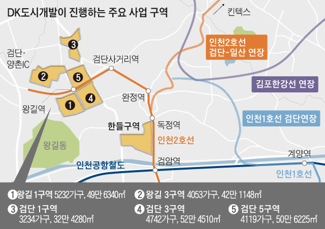 인천 지하철 2호선 끝자락인 인천 서구 왕길역 일대. 왕복 6차로 주변의 넓은 구릉지와 농가들이 눈에 들어왔다. 도로 옆에는 검단 3구역을 알리는 울타리가 쳐져 있었다. 검단 5구역, 왕길 1구역 등 다른 도시개발사업 예정지도 연이어 보였다. 각각 4000가구가 넘는 대단지 아파트가 들어선다. 여기서 끝이 아니다. 2호선 독정역 주변에서는 4000여 가구 규모 한들구역도 개발될 예정이다. 모두 민간 부동산 개발회사인 DK도시개발이 진행하는 프로젝트다.