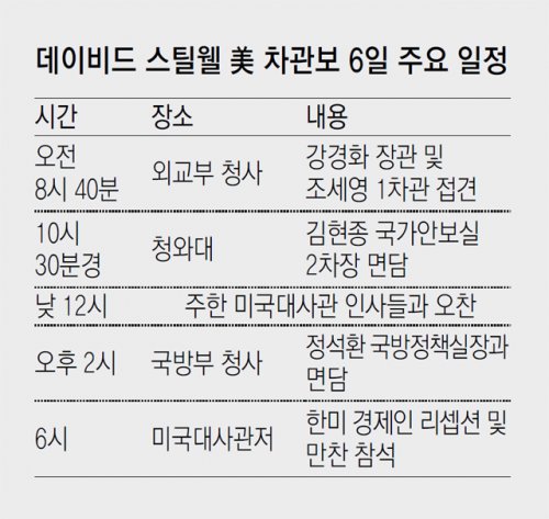 방위비 분담금 협상에선 한미가 팽팽한 평행선을 그리고 있다. 스틸웰 차관보는 이날 오후 해리 해리스 주한 미 대사관저에서 열린 만찬에서 방위비 협상과 관련해 “(한국이 부담할 수 있는) 적정한(appropriate) 수준의 방위비 분담금 규모가 얼마인지 파악하러 온 것이다. 7일 관계자를 만나서 규모를 알아볼 것”이라고 말한 것으로 전해졌다. 또 “미국 정부는 구체적인 분담금 금액을 적시해서 (한국 측에 이미) 제시했다”고 말했다고 한 외교 소식통은 전했다.