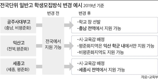 전국에서 학생을 선발하는 자사고는 선발 지역이 광역 단위로 축소되고, 전국 단위 모집 일반고는 모집 특례가 폐지된다. 예를 들어 전북 상산고 같은 경우는 현재 전국 단위에서 지원이 가능하지만 2025년부터는 평준화 지역인 전주 학군과 비평준화 지역 학생만 지원할 수 있다. 비평준화 지역인 강원도에 있는 민족사관고는 강원 전역에서만 선발할 수 있다.