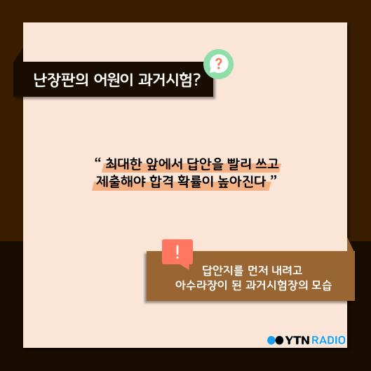 ◆ 김준우> 네, 자리 맡아야 해요. 일찍 가서 그 앞자리를 맡는 게 굉장히 중요합니다. 이게 또 왜 중요하냐면, 기록에 의하면 이런 상소가 올라와요. 과거시험장에서 사람들이 답안지를 제출했는데, 합격생의 답안지를 살펴보니 앞에 300장에서 다 나왔더라. 아까 이야기했잖아요. 3만 몇 장을 냈다고요. 그런데 앞 300장에서 이미 합격자가 다 나와 버렸더라. 그거 언제 다 채점하고 있느냐고 해서 앞에서만 채점을 한 것이죠. 그러니까 사람들이 최대한 앞에 가서 빨리 문제 보고, 답안 빨리 쓰고, 빨리 제출해야 합격 확률이 높아진다는 거예요. 그래서 너도 나도 앞자리를 맡으려고 밀치고, 때리고, 답안지 먼저 내려고 아수라장이 된 것이죠. 실제로 난장판의 어원이 난장, 어지러울 난(亂) 자에 장, 과거시험 장(場)을 뜻해요. 그 과거시험장의 모습을 난장판이라고 얘기하는 거죠.