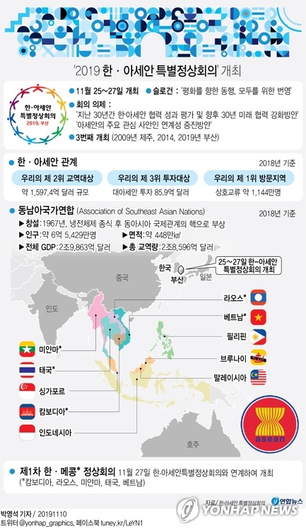 [※ 편집자 주 = 11월 25∼27일 부산에서 '2019 한·아세안 특별정상회의'와 '제1차 한·메콩 특별정상회의'가 열립니다. 특히 한·아세안 특별정상회의는 문재인 정부 출범 이후 우리나라에서 열리는 최대 규모 국제회의인 데다 정부가 추진하는 신남방 정책과 맞물려 외교적 의미도 크다고 할 수 있습니다. 개최도시 부산은 이번 행사를 계기로 '아세안 중심 도시'로의 도약을 기대하고 있습니다. 연합뉴스는 한·아세안 특별정상회의 D-15를 맞아 행사 개요와 부산시 등 관계기관의 손님맞이 준비 상황, 개최도시 부산에 미칠 경제·사회적 효과, 정상회의 개최 후 부산에서 진행되는 후속 사업 등을 살펴보는 기사 3편을 송고합니다.]