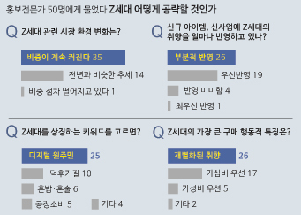 ‘비중이 계속 커진다’고 총 50명 중 35명이 답했다. ‘Z세대’의 대두가 거스를 수 없는 현실로 다가왔다는 뜻이다. 14명은 ‘전년과 비슷한 추세’라고 답했다. ‘비중이 점차 떨어지고 있다’는 답은 1명뿐이었다.