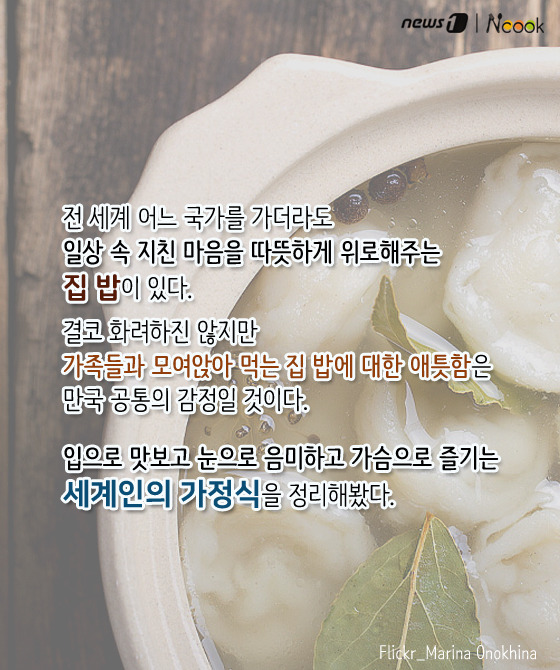 (서울=뉴스1) 박라경 에디터 = 전 세계 어느 국가를 가더라도 일상 속 지친 마음을 따뜻하게 위로해주는 집 밥이 있다. 결코 화려하진 않지만 가족들과 모여앉아 먹는 집 밥에 대한 애틋함은 만국 공통의 감정일 것이다. 입으로 맛보고 눈으로 음미하고 가슴으로 즐기는 세계인의 가정식을 정리해봤다.