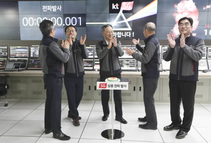 KT는 수도권과 6대 광역시, 제주도, 울릉도·독도에서 5G 전파를 발사했다. 과천 네트워크 관제센터에서 황창규 회장 등 주요 임직원이 역사적 현장에 동참했다.