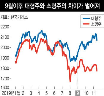 코스피가 2150까지 오르는 과정은 둘로 나뉜다. 첫번째 상승은 9월에 시작해 10월 중순까지 이어졌는데 중국 소비 관련주와 아이티(IT) 하드웨어, 대형 바이오 주식이 주역이었다. 두번째 상승은 11월에 시작됐고 1차 상승 때 제외됐던 종목이 중심이 됐다. 이 둘을 결합하면 짧은 상승 기간에도 순환매가 나타날 정도로 종목별 변화가 컸음을 알 수 있다. 지난 석달간 주가 상승은 에너지가 강하지 않은 상태에서 진행됐다. 외국인이나 기관투자자가 매수할 때만 대형주가 상승할 정도로 상태가 좋지 않았는데 주가가 조정에 들어가면 힘이 더 떨어질 수밖에 없다. 시장 환경상 중소형주에서 대안을 찾을 수밖에 없는 상태가 된 것이다.