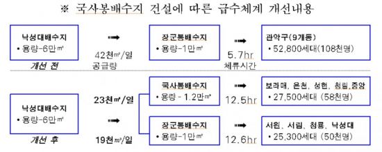 국사봉배수지 가동으로 그동안 정수장에서 낙성대배수지, 장군봉배수지를 거쳐 공급되던 물이 장군봉과 국사봉 두 곳의 배수지로 분산된다. 국사봉과 장군봉은 각각 1만2000㎥, 1만㎥ 용량이다. 이에 따라 수돗물의 배수지 체류시간은 기존보다 배 이상 늘어난 12시간30분이 된다. 체류시간이 늘면 누수나 단전 같은 비상 상황에서도 하루가량 정상적인 수돗물 공급이 가능하다. 아울러 수돗물 공급을 위한 평균 수압도 50%가량 높아져 직결급수가 가능해졌다.