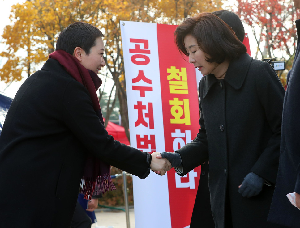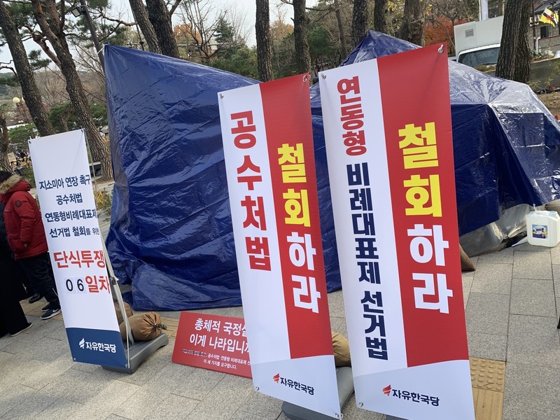이날 오전엔 이해찬 더불어민주당 대표가 단식 중인 황 대표를 방문했다. 5분간 비공개로 황 대표와 만난 이 대표는 “(황 대표가) 기력이 빠져 있어서 거의 말씀을 못 한다”며 “김도읍 비서실장에게 빨리 단식을 중단하고 저와 협상하자고 했다”고 말했다. 이 대표가 천막을 방문하자 근처에 있던 황 대표 지지자들이 “물러가라”며 고성을 지르기도 했다.