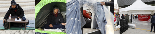 그러다 주말 사이 비바람에 이 임시 천막이 쓰러지자 25일 한국당이 청와대 분수대 광장 앞에 흰색 몽골 텐트를 설치해 황 대표의 거처를 옮긴 것이다. 당 대표 비서실장인 김도읍 의원은 “처음부터 (청와대가) 천막 치는 걸 방해했고 그런 상황에서 저희의 뜻을 관철하기 위해 비닐로 바람을 막고 영하의 추운 날씨를 견뎌왔다”며 “그런데 비서실장 입장에서 도저히 목숨을 건 투쟁을 하는 대표가 칼바람을 그대로 맞는 것을 두고 볼 수 없어서 오늘 천막을 다시 친 것”이라고 설명했다.