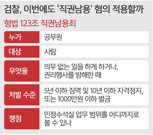 민정수석실은 5대 사정기관인 검찰·경찰·국가정보원·국세청·감사원으로부터 각종 기밀정보를 전달받아 이를 정리한 뒤 대통령에게 보고한다. 또 대통령 친인척 관리 및 공직기강 관리도 도맡고 있어 그 직무 범위가 대단히 넓은 편이다. 다만 선출직 공무원에 대한 감찰 또는 수사지휘는 민정수석실의 업무에서 벗어난다. 서울 서초동의 한 변호사는 “업무 권한 밖의 일을 했다면 직권남용이 성립할 수 없지만, 민정수석실의 업무 범위가 워낙 광범위하기 때문에, 검찰로서는 직제 규정 등을 꼼꼼히 검토해야 할 것으로 보인다”고 말했다.