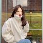 사진 속 강민경은 흰색 자켓에 청바지를 입고 카페 앞에 앉아있다. 강민경은 두 손을 주머니에 넣고 움츠린 채 입을 벌리고 카메라를 쳐다보고 있다. 옆에는 아이보리색 텀블러가 놓여있다.