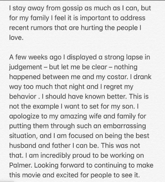 그는 "나는 그날 밤 술을 너무 많이 마셨고 내 행동을 후회한다. 이건 내가 우리 아들에게 보여주고 싶었던 모습이 아니었다. 아내와 가족을 이런 당황스러운 상황과 마주하게 만들어 너무 미안하다"라고 반성했다. "할 수 있는 한 최고의 남편과 아빠가 되고 싶었데 이건 아니었다"라고 덧붙였다.