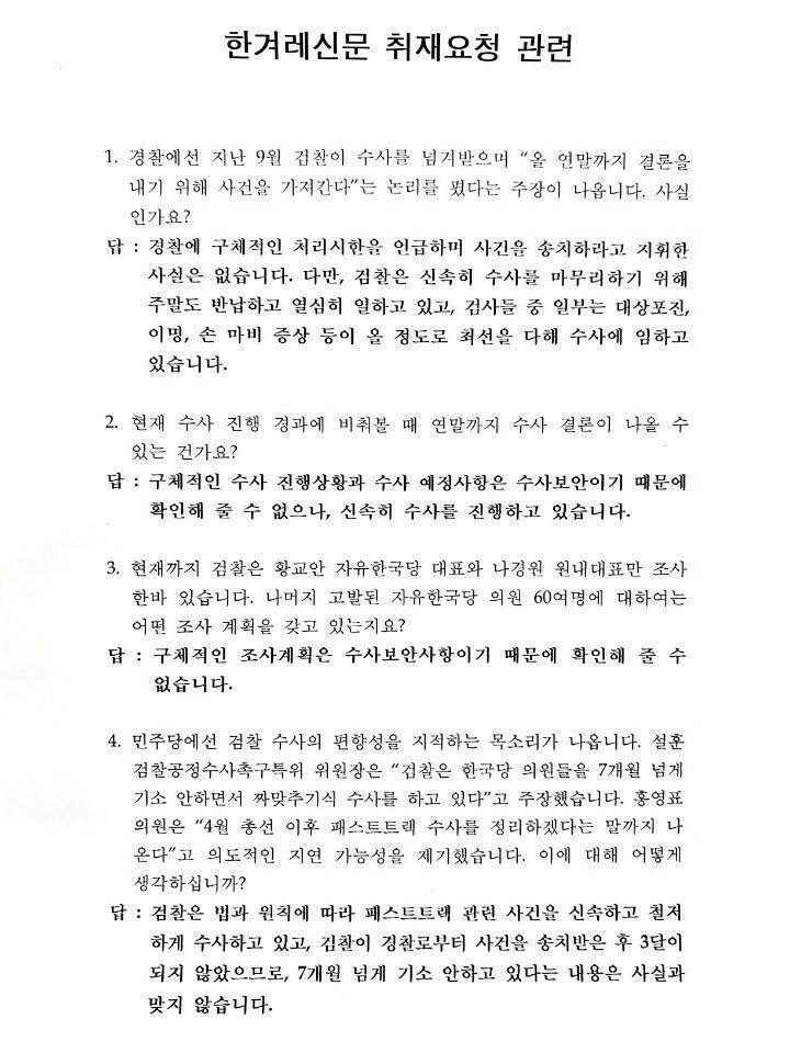 대검은 보시다시피 “법과 원칙에 따라 수사하고 있음” “신속히 수사하고 있음” 두 줄로 갈음되는 답변을 보내왔습니다. 존댓말로 물었는데, 답변은 심지어 말도 짧군요. 내부 문서도 아니고 기관 사이에 주고받는 공문도 아닌 민간이나 언론 질문에 이런 문투를 쓰는 공공기관이 또 있을까요. 사소해보이지만, 이런 점이 검찰이 오만하다는 느낌을 키우는 요인 아닐까요.