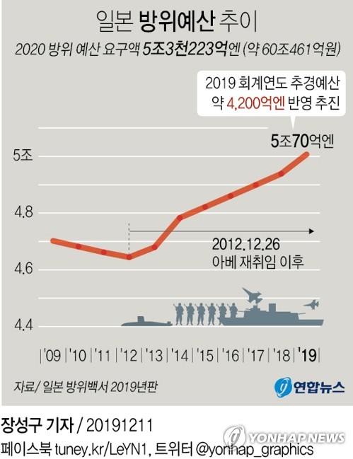 (도쿄=연합뉴스) 이세원 특파원 = 일본 정부는 2019 회계연도(2019년 4월∼2020년 3월) 추경 예산안에 방위비로 약 4천200억엔(약 4조6천110억원)을 반영하는 방향으로 최종 조율 중이라고 산케이(産經)신문이 11일 보도했다.