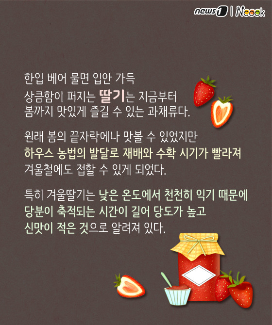 (서울=뉴스1) 박라경 에디터 = 한입 베어 물면 입안 가득 상큼함이 퍼지는 딸기는 지금부터 봄까지 맛있게 즐길 수 있는 과채류다. 원래 봄의 끝자락에나 맛볼 수 있었지만 하우스 농법의 발달로 재배와 수확 시기가 빨라져 겨울철에도 접할 수 있게 되었다. 특히 겨울딸기는 낮은 온도에서 천천히 익기 때문에 당분이 축적되는 시간이 길어 당도가 높고 신맛이 적은 것으로 알려져 있다.