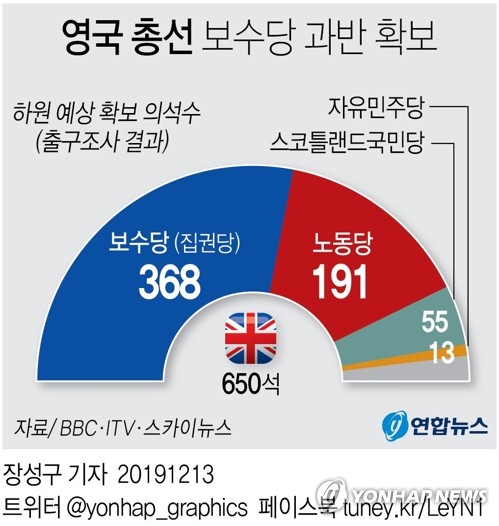 (런던=연합뉴스) 박대한 특파원 = 100여년 만에 열린 12월 총선에서 영국 보수당이 압도적인 승리로 재집권에 성공할 것으로 예측됐다.