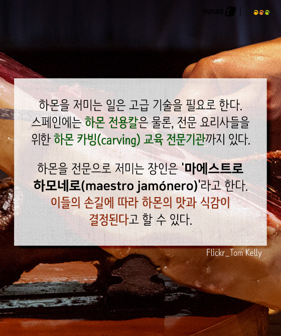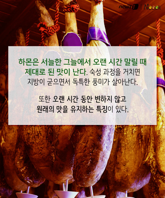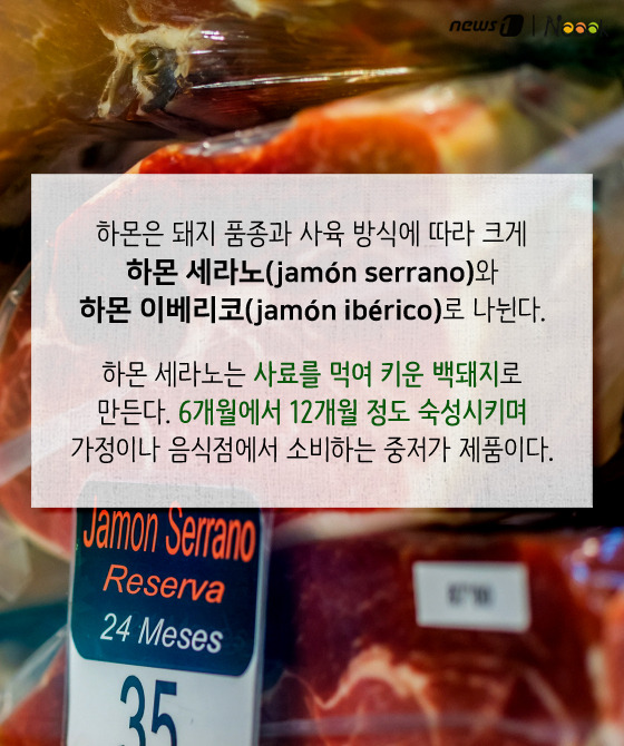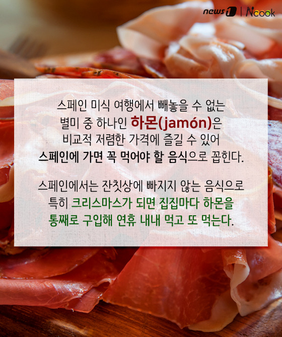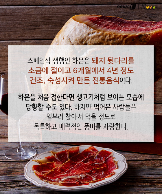(서울=뉴스1) 박라경 에디터 = 하몬(jamón)은 스페인에서 잔칫상에 빠지지 않는 음식으로 특히 크리스마스가 되면 집집마다 하몬을 통째로 구입해 연휴 내내 먹고 또 먹는다. 하몬을 처음 접한다면 생고기처럼 보이는 모습에 당황할 수도 있다. 하지만 한번 먹어본 사람들은 일부러 찾아서 먹을 정도로 독특하고 매력적인 풍미를 자랑한다.