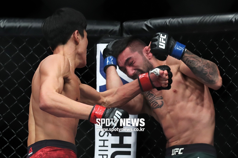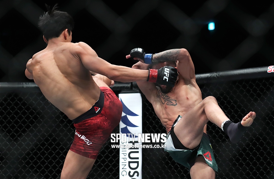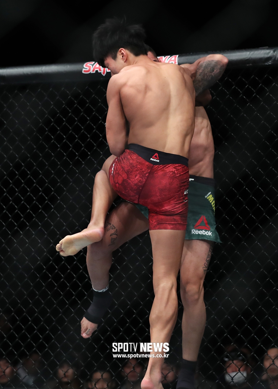 UFC에 데뷔하고 2연패에 몰려 있던 최승우의 전략은 공격 또 공격. 경기 시작부터 헤드킥, 보디킥, 로킥으로 모크라이안을 압박했다. 정확성도 힘도 있었다. 모크타리안은 뒷걸음질칠 수밖에 없었다.