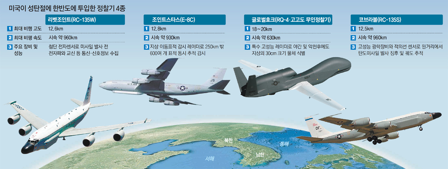 이후 9∼16km 고도에서 평안북도 동창리 발사장과 북-중 접경지역의 대륙간탄도미사일(ICBM) 및 중거리탄도미사일(IRBM) 기지, 원산 신포 일대의 잠수함발사탄도미사일(SLBM) 기지 등을 집중 감시한 것으로 알려졌다. 휴전선 인근을 비롯한 북한 전역의 이동식발사대(TEL)와 장사정포 동향 등도 촘촘히 들여다봤다고 한다. 기종별로 고도를 달리하면서 이중 삼중의 그물 감시망을 가동한 것이다. 주일미군의 공중급유기 1대도 정찰 지원을 위해 동해 상공에 투입됐다. 이날 저녁엔 코브라볼 1대가 추가로 동해상에 전개됐다.