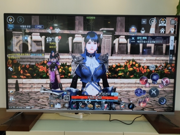 캐릭터나 펫의 모델링인 물론이고 캐릭터 주위의 자연 환경이나 건축물들의 퀄리티가 모바일 화면에서 보던 것과 완전히 달라보였다. 게다가 이런 그래픽이 75인치급 화면에서 보여지다 보니 오히려 가까이에서 보는 것이 부담스러울 정도였다.