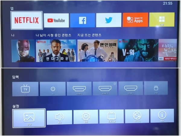 TV를 켜면 나오는 홈 화면은 아주 깔끔하다. 상단에는 주요 앱들이 세팅돼 있고, 아래에는 시청 중이던 콘텐츠와 화제가 되는 콘텐츠가 노출된다. 그리고 그 아래에는 입력 포트와 주요 설정 메뉴들이 배치되어 있다. 홈 화면에 TV의 모든 기능이 노출되는 셈이다.