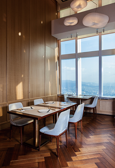 문을 열고 들어서면 커다란 창으로 쏟아져 들어오는 하늘빛이 객을 맞는다. 그야말로 탁 트인 전경을 찬찬히 내다보면 (한강 뷰가 아닌 게 살짝 아쉽지만) 저 멀리 서울공항의 활주로가 눈에 들어올 만큼 시야가 높고 넓다. 이곳의 소믈리에인 노태정 매니저의 말을 빌면 “전경이 또 하나의 주제가 돼 식사시간의 즐거움을 더하는 곳”이다. 일월(日月)·산천(山川)·죽송(竹松)·구학(龜鶴)·백록(白鹿)이란 이름을 단 5개의 룸과 총 32인석의 홀 테이블을 갖추고 있는데, 전광식 총괄셰프가 계절마다 식재료를 엄선해 내놓는 코스요리(7만7000~21만원)가 백미다. 주로 비즈니스미팅이나 친목 모임이 많은데, 신동빈 롯데그룹 회장의 단골식당 중 한 곳이다.
