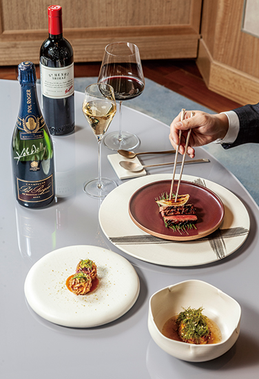 <매경LUXMEN>을 위해 전 셰프가 준비한 메뉴는 총 3가지. 코스요리에 빠지지 않고 등장하는 ‘채끝등심소금구이’와 ‘새우강정’ ‘생복만두’다. 여기에 노태정 소믈리에가 준비한 와인은 호주의 레드와인 ‘펜폴즈 생헨리 쉬라즈’와 프랑스 샴페인 폴로저의 ‘뀌베 서 윈스턴 처칠’. 샴페인이 전채요리와 생복만두에 어울린다면 펜폴즈 생헨리 쉬라즈는 채끝등심과 궁합이 딱 맞다는 게 노 소믈리에의 설명이다.