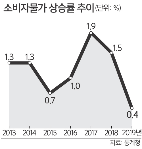 2019년 소비자물가지수 상승률이 1965년 통계 작성 이후 역대 최저치를 기록했다. 예고된 결과라도 해도 과언이 아니다. 지난해 1월부터 12월까지 1년 내내 0%대, 심지어 마이너스 상승률까지 기록한 결과다.