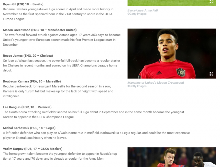 50인 명단에는 FC 바르셀로나의 안수 파티, 맨체스터 유나이티드의 메이슨 그린우드, 아스널의 가브리엘 마르티넬리, 레드불 잘츠부르크의 도미닉 소보살라이 등 10대의 나이로 유럽 빅리그에서 활약하는 선수들이 다수 포함됐다.