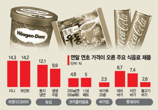 새해 벽두부터 먹거리 가격이 줄줄이 오르면서 그야말로 물가대란 조짐을 보이고 있다. 커피부터 아이스크림, 탄산음료, 햄버거, 라면 등 안오르는 품목이 없을 정도다. 업체들은 인건비, 원재료 등의 비용상승을 가격 인상 요인으로 내세우고 있다. 매년 연말과 연초에 가격 인상이 되풀이되는 것을 두고 관행적 조치란 비판이 나오지만 지난해 급감한 수익률 회복을 위해서는 어쩔수 없다는 입장이다. 게다가 올해는 작년보다 가격 인상이 더욱 봇물을 이룰 것이란 전망이 거세 소비자들이 직접 체감하는 장바구니 물가 부담도 커질 것으로 보인다.