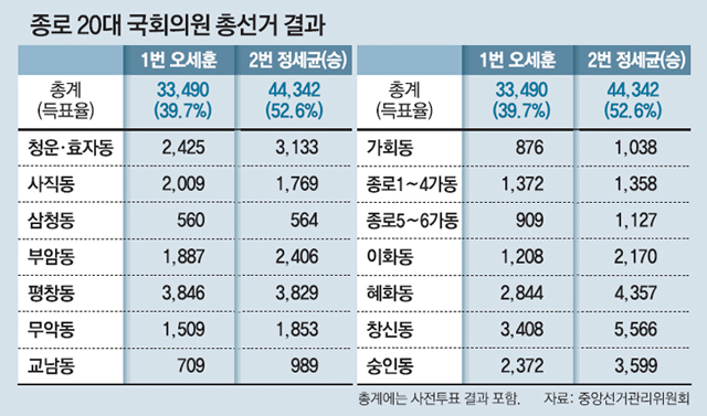 정치권에서는 종로구민의 정치성향은 대체로 주민 평균 연령대가 높아 중도 보수에 가까운 것으로 평가하고 있다. 실제로 1988년 이후 종로에서 당선된 민주당 계열의 후보는 노 전 대통령과 정세균 의원뿐이다. 다만 정 의원이 재선을 하면서 다져놓은 지역기반이 탄탄해 표밭이 이전과 많이 달라졌다. 지역별로는 창신동 숭인동은 민주당이, 평창동 사직동 등은 한국당 지지세가 강한 편이다. 민주당 관계자는 “정 의원이 보수층을 집중 공략해 놓은 데다 새로 유입된 젊은층 인구 등을 감안했을 때 해볼 만한 지역”이라고 말했다. 한국당 관계자는 “자영업자 등 경제상황에 민감한 이들이 전에 없이 정부를 비판하고 있다. 후보만 일찍 결정된다면 이길 수 있다”고 했다.