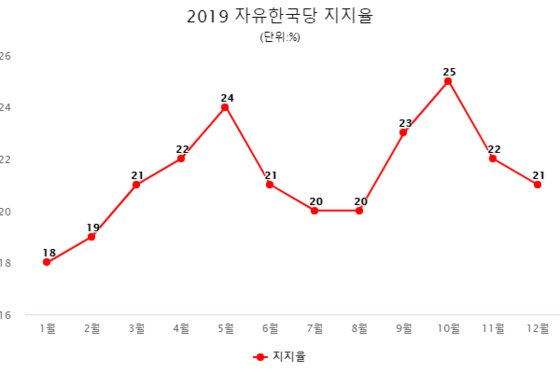황 대표 취임 이후 한국당 지지율은 결과적으로 2%포인트(19%→21%) 오르는데 그쳤다. 한국갤럽이 지난해 1∼12월 전국 만19세 이상 4만7134명을 대상으로 실시한 조사(95% 신뢰도에 표본오차 ±1.6%포인트, 중앙선거여론조사심의위 홈페이지 참고)에 따르면 황 대표 취임(2월27일) 당시 한국당 지지율은 19%(2월)였다. 이후 24%(5월)까지 꾸준히 상승했던 지지율은 그러나 줄곧 20% 초반을 벗어나지 못했다. 조국 사태가 절정에 달했던 10월에는 25%까지 올랐지만 11월 22%, 12월 21% 등 하락세다.