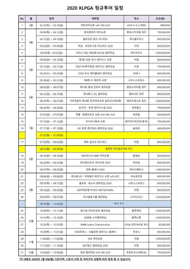 한국여자프로골프협회(회장 김상열)는 6일 “지난해 296억6000만원이었던 전체 투어(드림, 점프, 챔피언스 투어 포함) 총상금액은 올해 16억원이 증가해 313억원에 육박하게 됐다”고 공식 발표했다. 지난 2019 시즌 대회 수 30개, 총상금 253억원으로 치러진 정규투어는 지난해보다 1개 대회가 늘어나고 총상금은 16억원이 늘어나 31개 대회에 총상금 269억원의 규모로 열릴 예정이다.