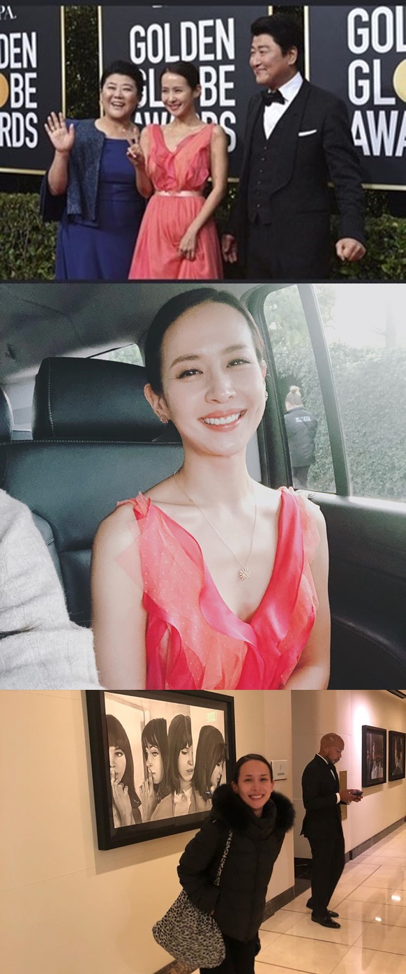 조여정은 6일 자신의 인스타그램에 "트로피 단체사진도 못찍고 나와 드레스만 벗고 공항으로 달려가지만 입이 귀에 걸려있으니 괜찮습니다"라는 글과 함께 사진 여러 장을 게재했다.