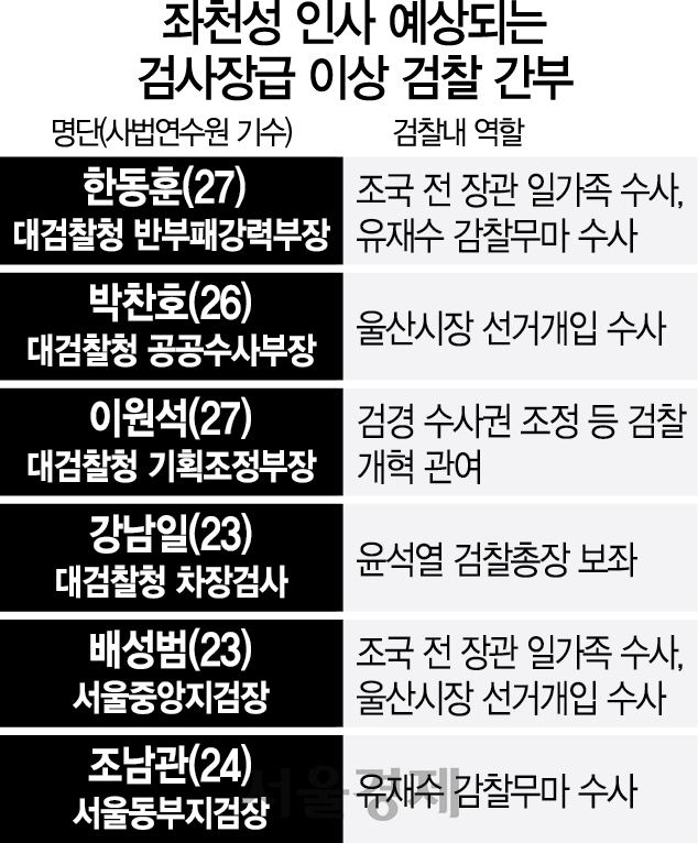 인사에 대한 검찰총장 의견 청취 절차를 두고 추 장관과 윤 총장의 줄다리기가 이어지면서 검찰 인사 발표는 한동안 지연될 것으로 전망된다. 그럼에도 결국 현 검찰 지휘부에 대한 대대적인 교체는 막기 어려울 것으로 예상된다. 대검 간부들 가운데는 조국 전 법무부 장관 일가족 수사와 ‘유재수 감찰무마 의혹’ 수사를 담당한 한동훈(27기) 대검 반부패·강력부장, ‘청와대 선거개입 의혹’ 수사의 지휘라인에 있는 박찬호(26) 대검 공공수사부장을 지방 검찰청 검사장으로 보낼 것이라는 관측이 우세하다. 앞선 수사를 일선에서 지휘한 배성범(23) 서울중앙지검장과 조남관(24) 서울동부지검장도 고검장으로 ‘좌천성 승진’을 시킬 것으로 전망된다. 또 윤 총장을 보좌한 강남일(23) 대검 차장과 이원석 대검 기획조정부장도 교체 대상으로 거론된다. 다만 윤 총장이 법무부로부터 인사안을 받아본 다음 수사방해 등 법적으로 문제가 있는 수준이라고 판단하고는 대응에 나설 가능성도 배제할 수 없다.