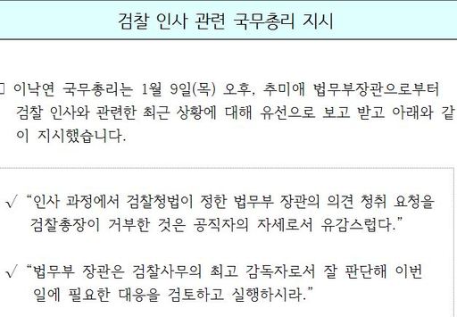 국무총리실에 따르면 이낙연 국무총리는 추 장관 보고 뒤 "인사 과정에서 검찰청법이 정한 법무부 장관의 의견 청취 요청을 검찰총장이 거부한 것은 공직자의 자세로서 유감스럽다"며 윤 총장 행위를 사실상 항명으로 판단했다.