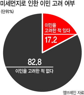 헤럴드경제가 여론조사 전문기관 엠브레인과 진행한 ‘미세먼지 관련 대국민 인식조사’(신뢰수준 95%, 오차범위±3.10%p)에 따르면, 미세먼지로 이민을 고려해 본 적이 있다는 응답이 17.2%를 차지했다. 연령대로 보면 30대의 이민 고려율이 22.4%로 가장 높았다. 이어 20대가 19.7%, 40대 17.4%, 50대 10.8%가 뒤를 이었다. 지역별로는 서울(22.2%) 경기·인천·강원 (21.2%) 충청 (13.3%) 전라 (13.2%) 경상 (10.6%) 순이었다.