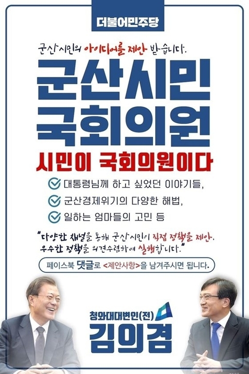 14일 정치권에 따르면 김의겸 전 대변인은 지난 9일 페이스북에 올린 총선 포스터에서 문 대통령 사진과 마주보는 사진과 함께 ‘대통령님께 하고 싶었던 이야기들’이라는 대목을 넣어 과도한 대통령 마케팅이라는 논란이 일었다.