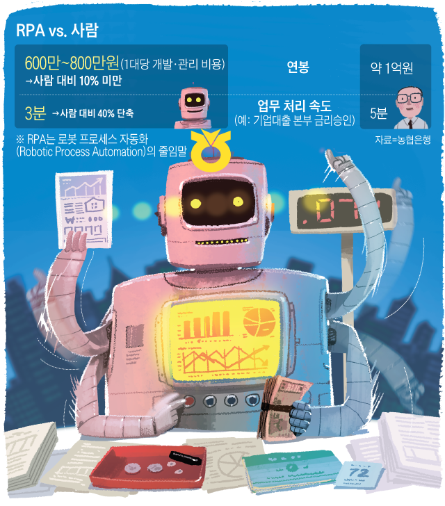 일하는 로봇인 RPA(Robotic Process Automation·로봇 프로세스 자동화) 도입이 은행권에서 확산되고 있다. RPA는 눈에 보이는 실물 로봇이 아니라 일종의 소프트웨어다. 사람이 정해준 규칙에 따라 방대한 자료를 조회하거나 비교·분석·입력하는 게 주특기다.