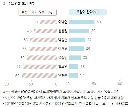 한국갤럽은 지난해 12월 둘째 주에 유력 대선주자들을 대상으로 ‘호감이 간다’와 ‘호감이 가지 않는다’를 선택하도록 하는 호감도 조사를 했습니다.