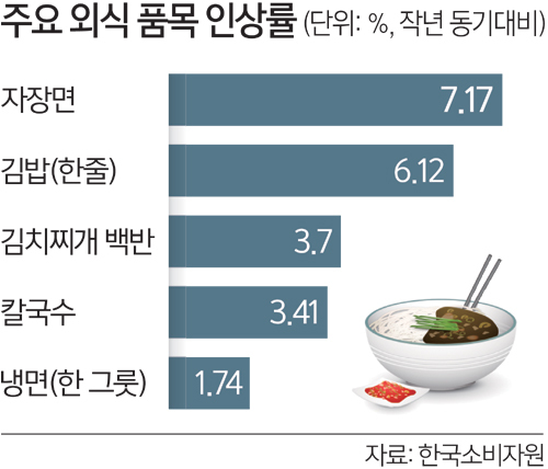 19일 한국소비자원과 관련 업계에 따르면 서울 지역에서 소비자들이 즐겨 찾은 대표 외식품목 8개 가운데 7개 가격이 1년 사이에 올랐다. 가장 가파르게 상승한 품목은 자장면이었다. 지난달 서울 지역의 자장면 그릇당 평균 가격은 5154원으로 전년 같은 달의 4808원보다 7.19 올랐다. 서울 지역에서 자장면이 가장 비싼 곳은 한 그릇에 7000∼8000원대인 것으로 알려졌다.