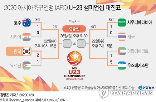 (랑싯[태국]=연합뉴스) 이영호 기자 = 2020 아시아축구연맹(AFC) 23세 이하(U-23) 챔피언십에서 한국, 호주, 우즈베키스탄, 사우디아라비아가 4강에 진출하면서 결승에서 한국과 우즈베키스탄의 리턴매치가 성사될 가능성이 생겼다.