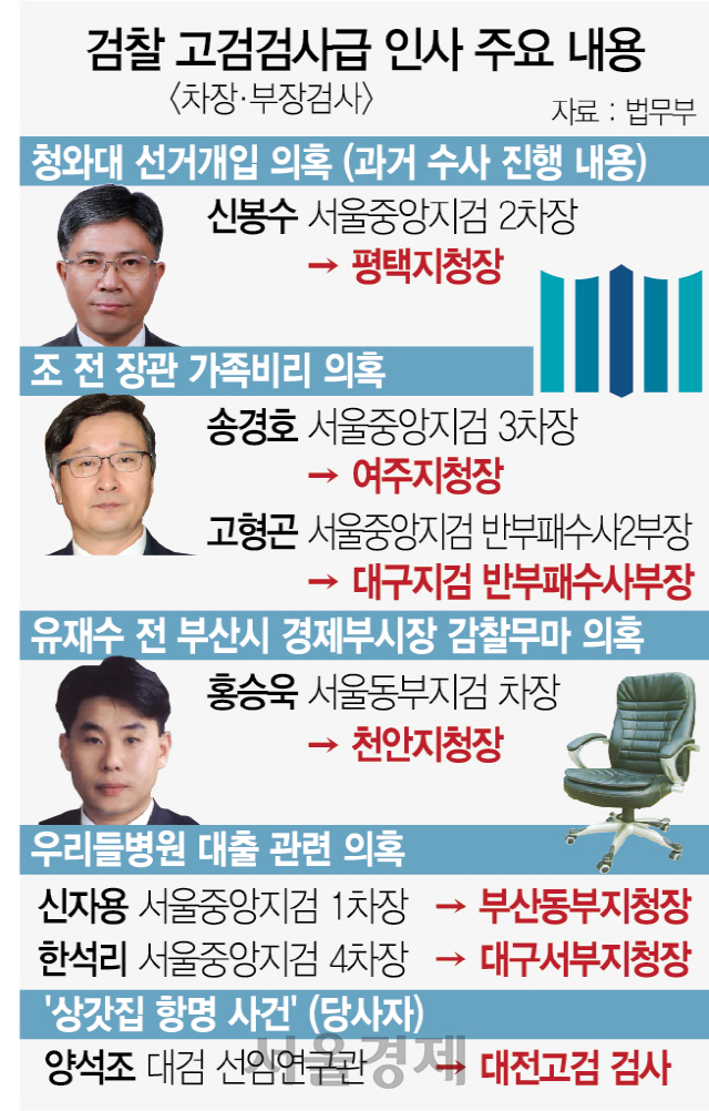 ‘수사방해’ 논란에도 불구하고 수사팀의 팀장 격인 일부 부장검사들 역시 교체됐다. 조 전 장관 관련 수사를 이어가고 있는 고형곤 반부패수사2부장은 대구지검 반부패수사부장으로, 여권 인사들이 연루된 신라젠 주가조작 사건을 수사한 김영기 증권범죄합동수사단장은 광주지검 형사3부장으로 발령 났다. 다만 청와대 선거개입 수사를 맡은 김태은 서울중앙지검 공공수사2부장, 조 전 장관 일가를 수사했던 이복현 반부패수사4부장, ‘유재수 감찰무마’ 관련 의혹을 수사 중인 이정섭 서울동부지검 형사6부장은 교체 대상에서 제외됐다.