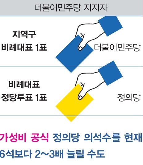 두 사람의 생각은 신년 여론조사에서도 비슷하게 나타납니다. 여러 여론조사에서 정의당에 대한 지역구 투표 의향은 5% 안팎이지만 비례대표 투표 의향은 14~15%로 집계됐습니다. <한국일보> 여론조사에서 민주당 지지자의 25.7%가 ‘지역구 민주당-비례대표 정의당’으로 분할투표를 하겠다고 응답했습니다. 민주당 한 당직자도 “내부 비공개 조사에서도 비슷한 흐름이 보인다. 이번에 분할투표가 확산될 것으로 보인다”고 말했습니다.