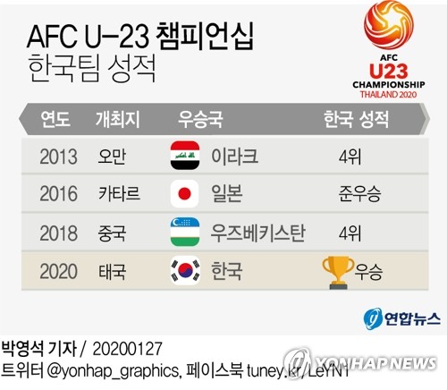 (방콕=연합뉴스) 이영호 기자 = 끝까지 두드리니 마침내 골문이 열렸다. 한국 축구가 2020 아시아축구연맹(AFC) 23세 이하(U-23) 챔피언십에서 120분 연장 혈투 끝에 첫 우승을 달성했다.
